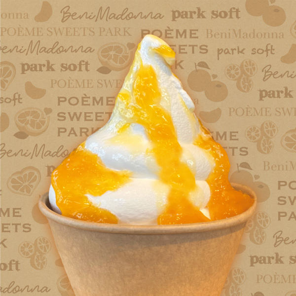 まるくて可愛い母恵夢スイーツパークのソフトクリーム「パークソフト」に、高級柑橘「紅まどんな」のソースをトッピング♪