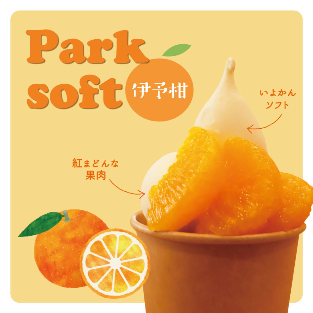 伊予柑100%ジュースを使用したソフトクリームに、みずみずしい紅まどんな果肉をトッピング。さっぱりとした口当たりのソフトに紅まどんなの甘さが引き立つ、冬限定のパークソフトです♡