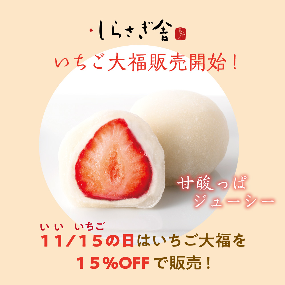 11月15日「いい いちごの日」は、いちご大福を15%OFFで販売いたします。