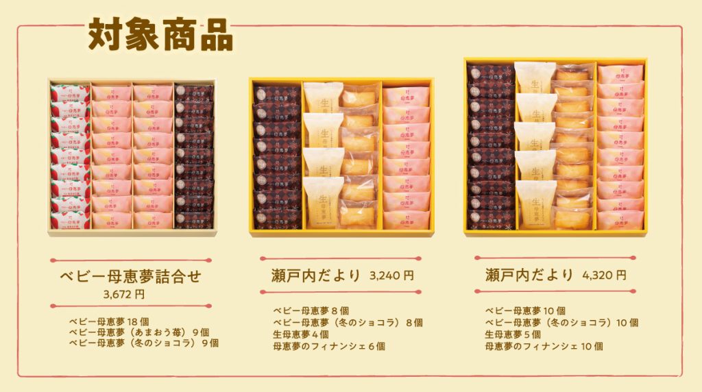 期間中、母恵夢スイーツパークで対象商品をお買い上げのお客様は、送料無料にてお送りいたします。大切な方へのギフトとしてご利用ください。