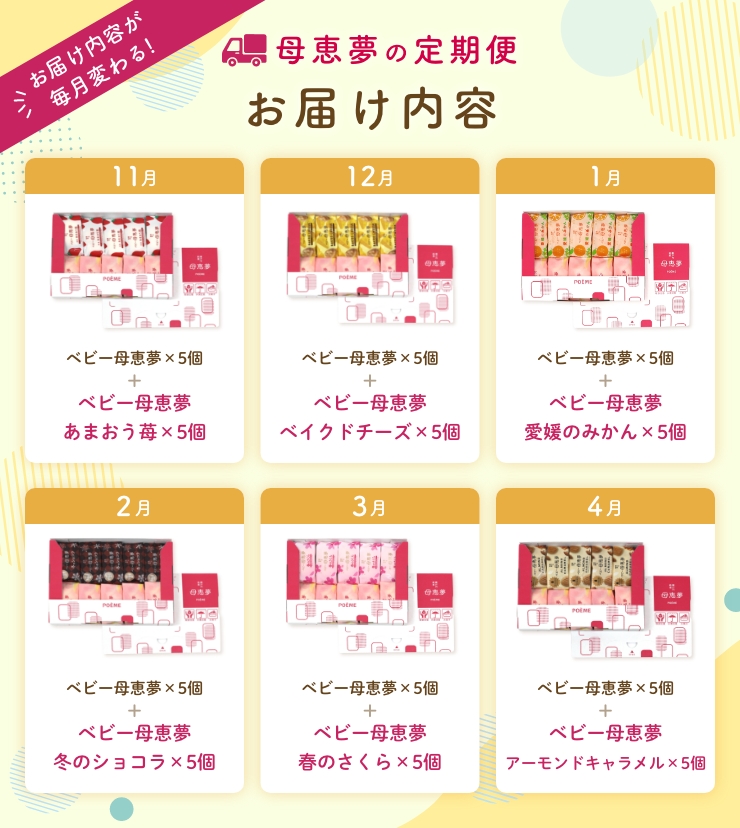 母恵夢を毎月楽しみたい!という方に、母恵夢の定期便をご用意しました。