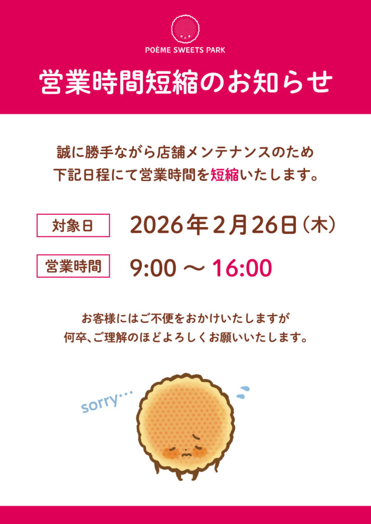 誠に勝手ながら店舗メンテナンスのため下記日程にて営業時間を短縮いたします。