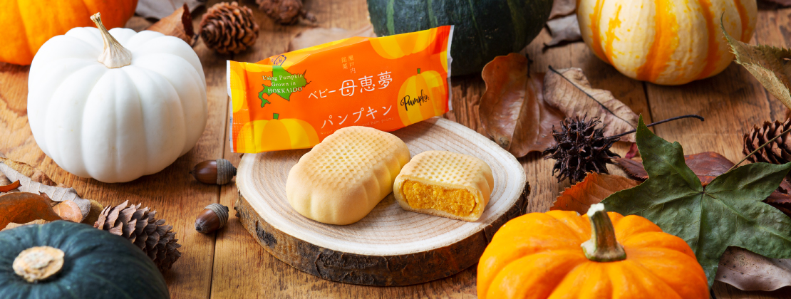 北海道えびすかぼちゃとバター、クリーミーなミルクがとけあった、濃厚なパンプキンスープをイメージした母恵夢です。ビビットなオレンジにかぼちゃのイラストをあしらったパッケージは、ハロウィンのお菓子にもぴったり!