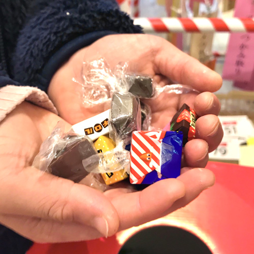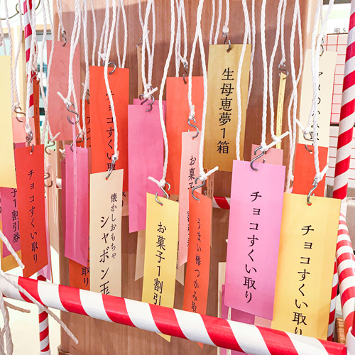 母恵夢で人気のお菓子や懐かしいおもちゃなどが当たる、