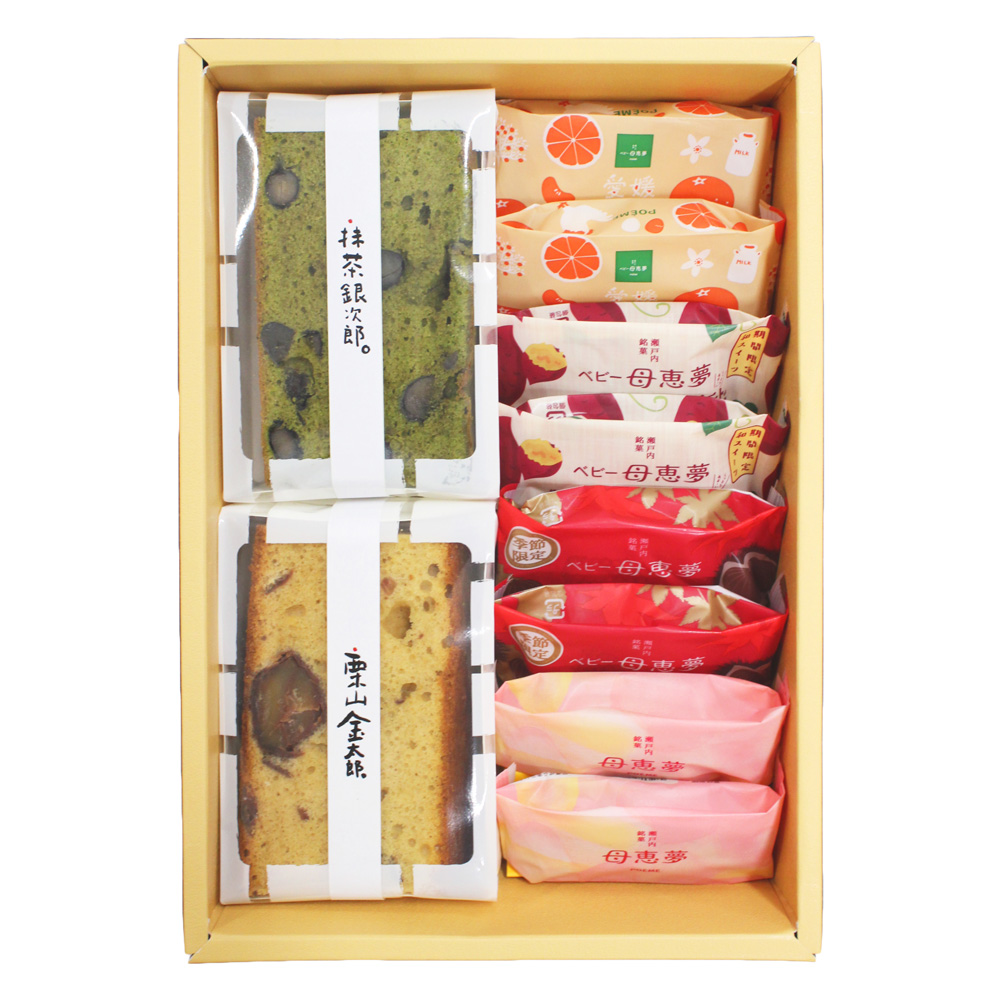 【内容】10個入り ベビー母恵夢(オリジナル味×2、愛媛のみかん×2、秋栗×2、安納芋のスイートポテト味×2)、パウンドケーキ(栗山金太郎×1、抹茶銀次郎×1)