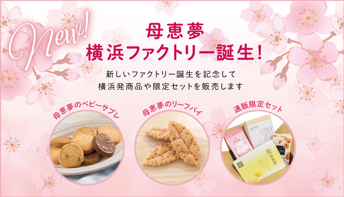 横浜ファクトリー誕生を記念して、母恵夢のお菓子をギュッと詰め込んだ、送料無料(※)のお得なセットをご用意しました。オリジナルの包装でお届けします。母恵夢のお菓子を食べ比べでお楽しみください。