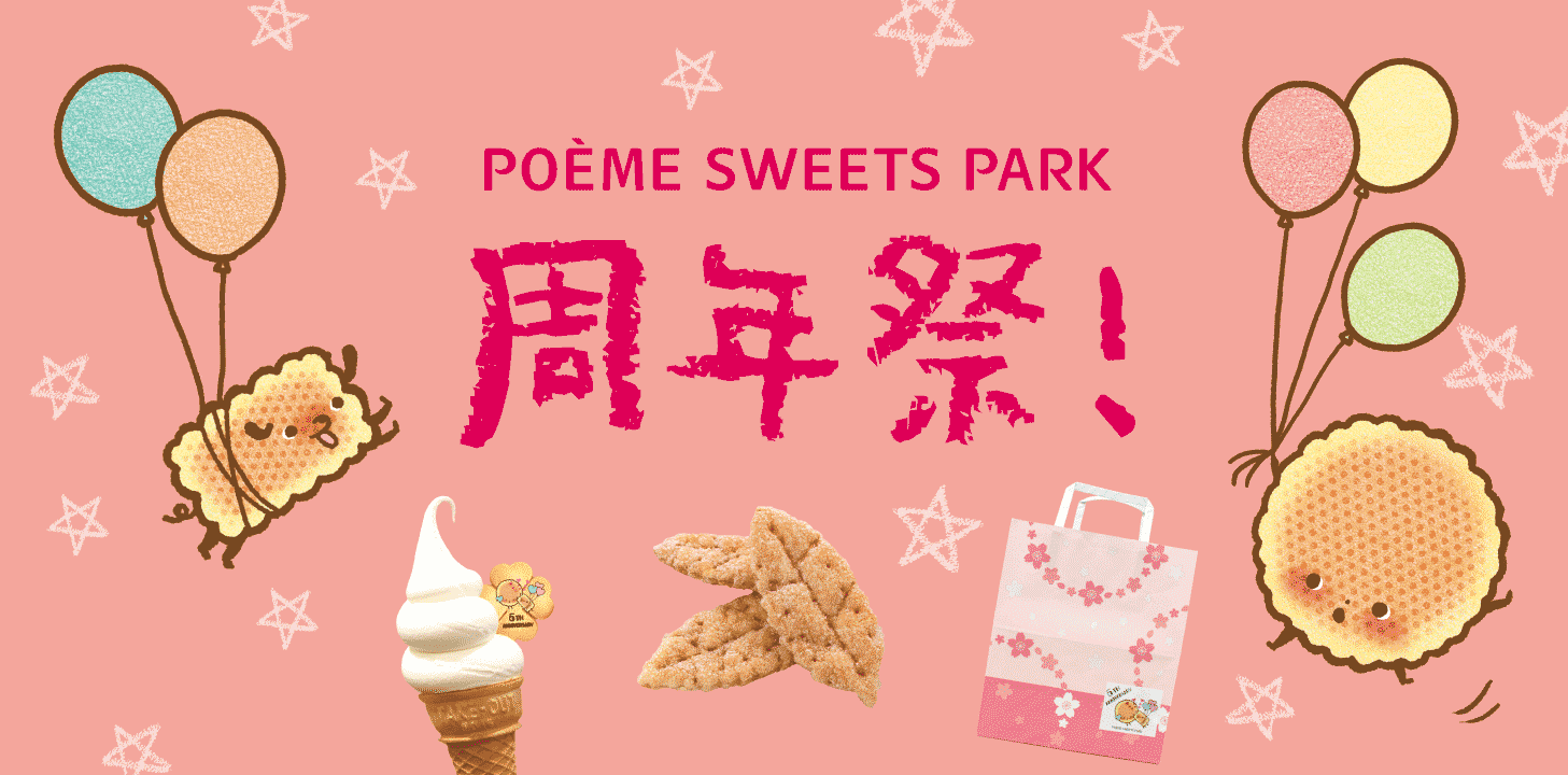 ポエムの製造工程が見られるテーマパーク「母恵夢スイーツパーク」が、おかげさまで5周年を迎えました。日頃よりご愛顧いただいている皆さまへ感謝の気持ちを込めて、周年祭を開催いたします。