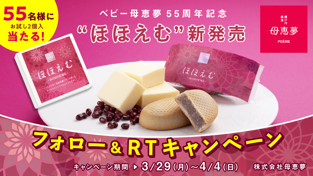 株式会社母恵夢公式Twitterアカウントをフォローのうえ、指定のツイートをリツイートしていただくと、4月1日にベビー母恵夢55周年記念で新発売となる「ほほえむ」お試し2個入りを抽選で55名様にプレゼントいたします。
