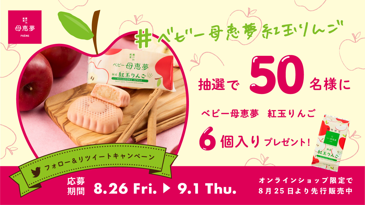 株式会社母恵夢公式Twitterアカウントをフォローのうえ、指定のツイートをリツイートしていただくと、9月1日に新発売となる、「ベビー母恵夢紅玉りんご」6個入りを抽選で50名様にプレゼントいたします。