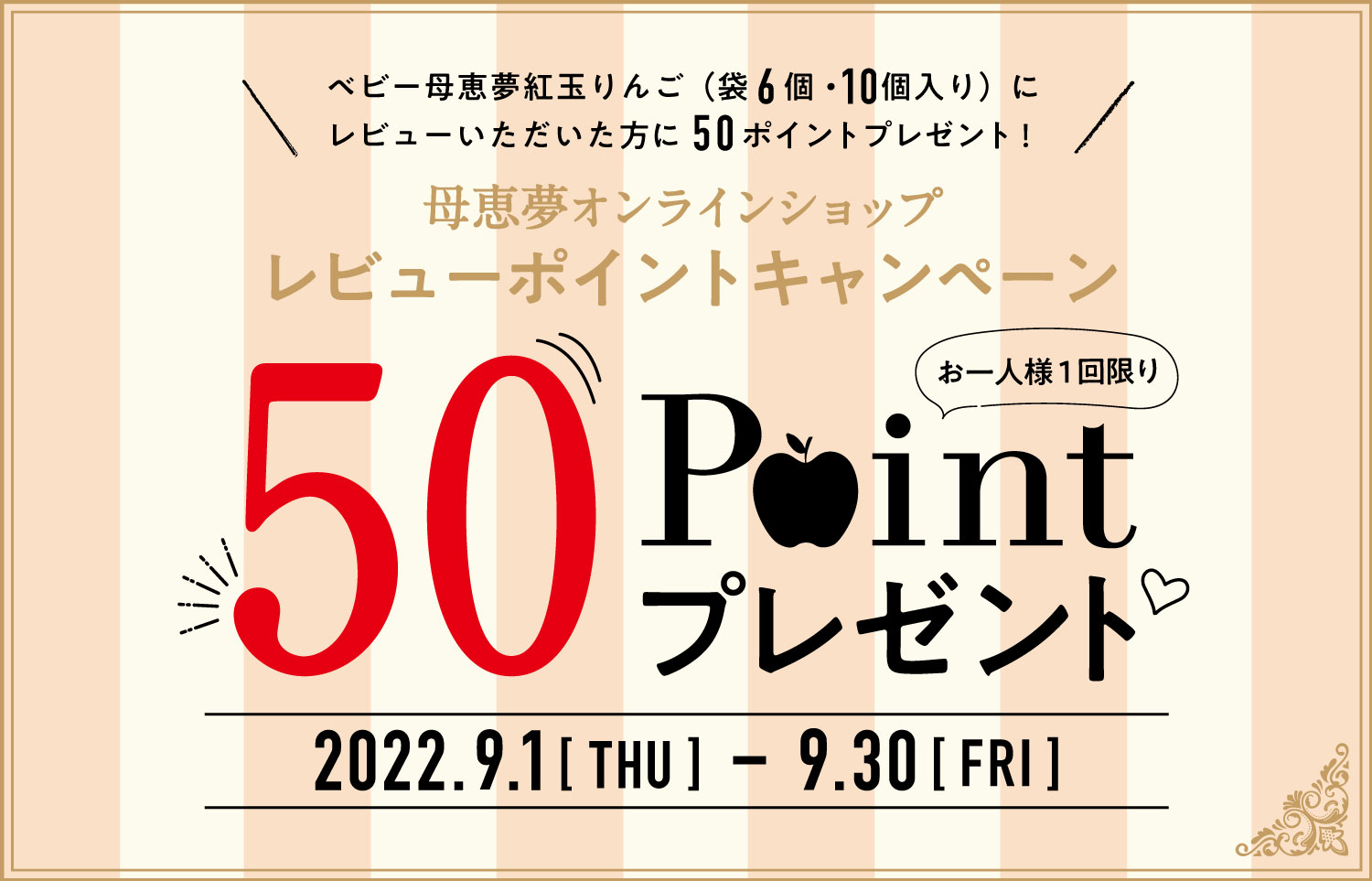期間中に「ベビー母恵夢紅玉りんご 袋6個入、10個入」の商品レビューを投稿いただいた方に、50ポイントプレゼント!