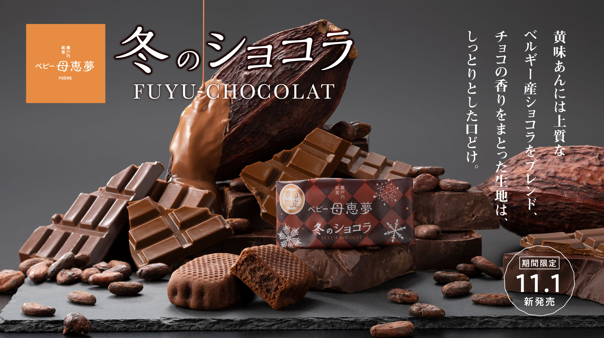 株式会社母恵夢(愛媛県 東温市)は、ロングセラーブランド「ベビー母恵夢(ベビーポエム)冬のショコラ」を2022年11月1日(火)〜2023年2月下旬までの期間限定で発売いたします。チョコレートのしっとりとした口どけと、柔らかく濃厚な味わいをお楽しみいただけます。