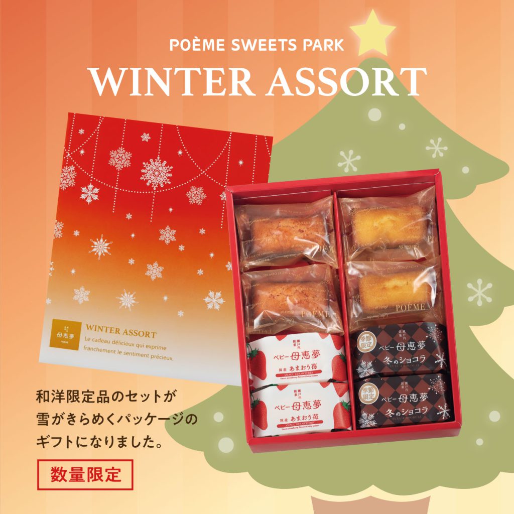 和洋の限定品をセットにしたギフトを、雪がきらめくパッケージでお届けします。