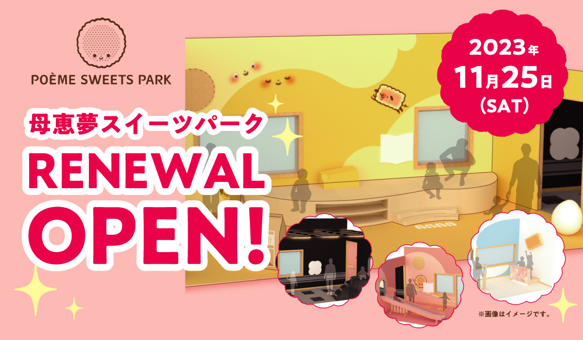 お菓子の工場とショップが融合した施設「母恵夢スイーツパーク」をリニュアルオープンいたします。
