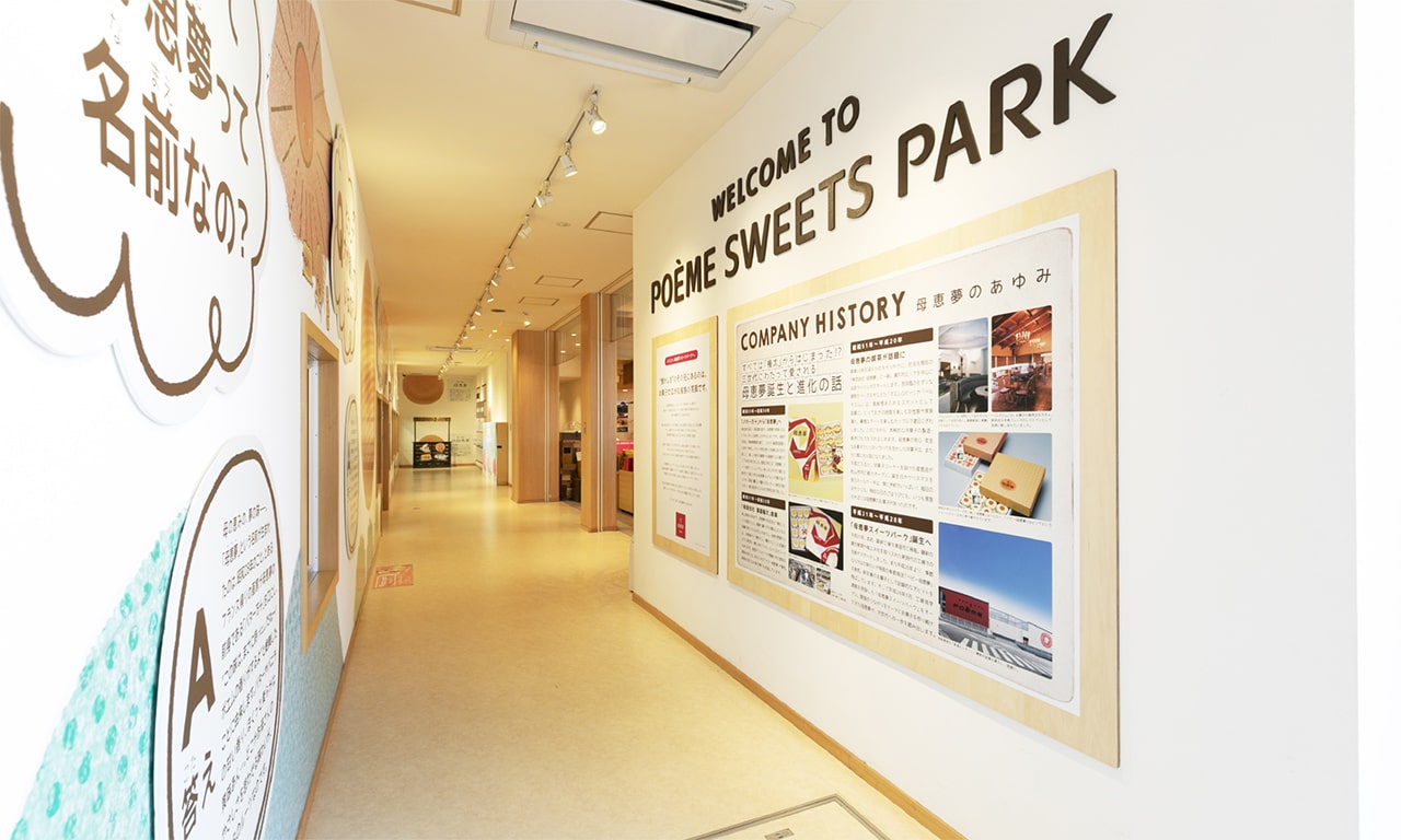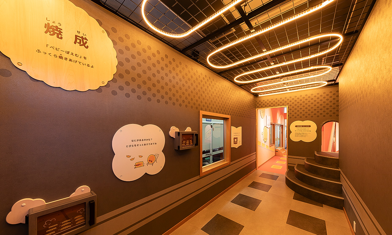 「母恵夢になろう!」がテーマの工場見学通路。4つの部屋には様々な仕掛けが…♪お菓子がつくられている様子も窓から覗けます。
